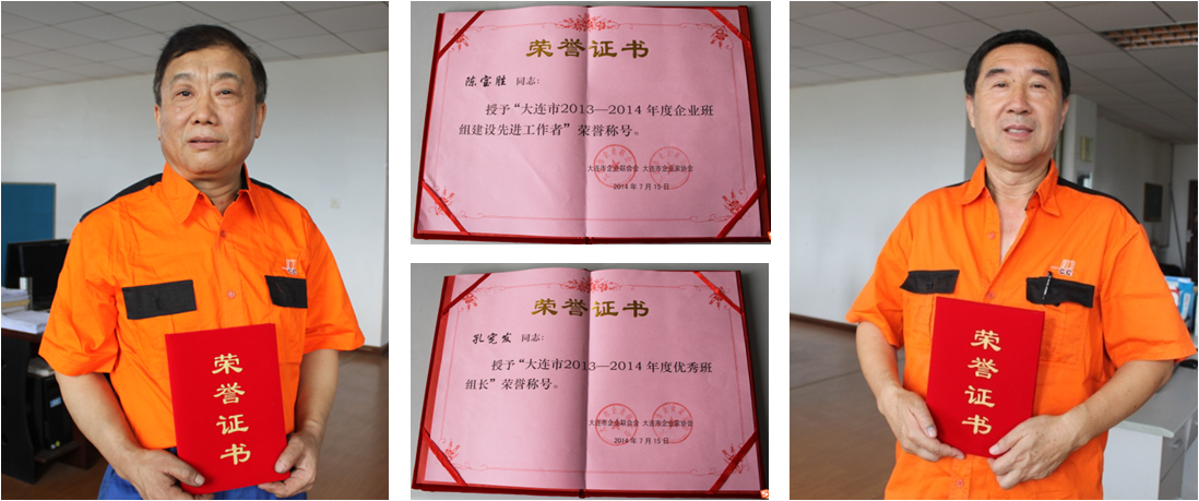 我公司結(jié)構(gòu)車間大車架班班長孔憲發(fā)、生產(chǎn)管理中心管理員陳寶勝分別榮獲“大連市2013-2014年度優(yōu)秀班組長”、“大連市2013-2014年度企業(yè)班組建設(shè)先進(jìn)工作者”榮譽稱號!