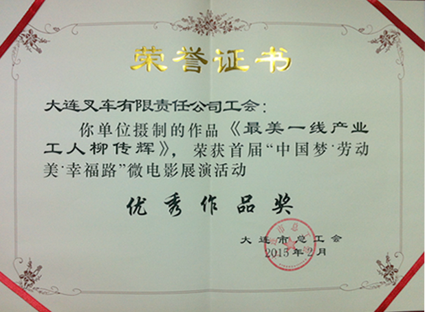近日,大連市總工會對于2014年年末舉辦的“中國夢●勞動美●幸福路”微電影展演活動的評選結(jié)果進(jìn)行了通報,大連叉車有限責(zé)任公司組織拍攝的微電影《最美一線工人柳傳輝》榮獲“優(yōu)秀作品獎”。