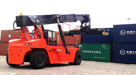 2002年,大連叉車設計出45噸正面吊運機并投入生產(chǎn),至今已有13年生產(chǎn)開發(fā)史。CRS450Z5型正面吊運機是專門為20英尺和40英尺國際集裝箱設計的,主要應用于集裝箱的堆疊和碼頭、堆場內(nèi)的水平運輸,于叉車相比,它具有機動靈活,操作方便,穩(wěn)定性好的特點。CRS450Z5型正面吊運機特別適用于中小港口,鐵路中轉站和公路中轉站的集裝箱裝卸,也可在大型集裝箱碼頭作為輔助設備來使用。整車設計高標準、高性能,在作業(yè)時可同時實現(xiàn)整車行走、變幅、臂架伸縮動作,具有較高的工作效率。原裝沃爾沃或康明斯發(fā)動機,燃油消耗低,符合歐Ⅲ排放標準,具有全天候易啟動的特點,保證車輛發(fā)揮其最大功率和最佳效率。變速箱、驅動橋、電器系統(tǒng)控制部分和液壓系統(tǒng)工作油泵、液壓閥塊等主要零部件均采用進口高端優(yōu)質部件,保證產(chǎn)品質量,屬具采用進口“ELME”型吊具,設計可使用200萬次以上。今年來該產(chǎn)品已經(jīng)服務于全國多個地區(qū)的港口碼頭和鐵路系統(tǒng),并且遠銷海外,深受國外客戶的青睞。
