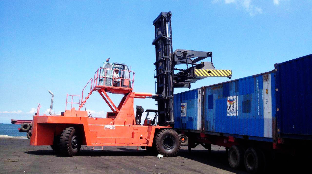 2002年,大連叉車設計出45噸正面吊運機并投入生產(chǎn),至今已有13年生產(chǎn)開發(fā)史。CRS450Z5型正面吊運機是專門為20英尺和40英尺國際集裝箱設計的,主要應用于集裝箱的堆疊和碼頭、堆場內(nèi)的水平運輸,于叉車相比,它具有機動靈活,操作方便,穩(wěn)定性好的特點。CRS450Z5型正面吊運機特別適用于中小港口,鐵路中轉站和公路中轉站的集裝箱裝卸,也可在大型集裝箱碼頭作為輔助設備來使用。整車設計高標準、高性能,在作業(yè)時可同時實現(xiàn)整車行走、變幅、臂架伸縮動作,具有較高的工作效率。原裝沃爾沃或康明斯發(fā)動機,燃油消耗低,符合歐Ⅲ排放標準,具有全天候易啟動的特點,保證車輛發(fā)揮其最大功率和最佳效率。變速箱、驅動橋、電器系統(tǒng)控制部分和液壓系統(tǒng)工作油泵、液壓閥塊等主要零部件均采用進口高端優(yōu)質部件,保證產(chǎn)品質量,屬具采用進口“ELME”型吊具,設計可使用200萬次以上。今年來該產(chǎn)品已經(jīng)服務于全國多個地區(qū)的港口碼頭和鐵路系統(tǒng),并且遠銷海外,深受國外客戶的青睞。