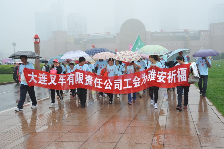 本次徒步大會仍以“健康、和平、交流”為主題,在輕松愉快的徒步過程中,可以收獲健康、傳遞和平,增進交流;可以放松精神,愉悅身心,溝通情感。“大連叉車與世界同行、大連叉車向全市人民問好、大連叉車,叉車搖籃,無尚榮光、大連叉車工會為雅安祈福”的大型條幅以及“大連叉車與您共贏、大連叉車與您同行”的小橫幅在細雨中格外醒目,引來眾多徒步愛好者和攝影愛好者的目光,四面藍色的廠旗和15面彩色的支會旗迎風(fēng)飄揚,展示著大連叉車朝氣蓬勃的精神風(fēng)貌, 大叉隊伍似一條長龍,蜿蜒在星海灣徒步大會主會場,隊伍中的每個人都昂首挺胸、精神抖擻,無時無刻不展示著作為一名大叉人的那份榮耀和自豪。